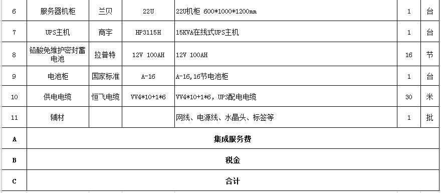 4、為保障服務(wù)器設(shè)備在斷電時不丟失業(yè)務(wù)數(shù)據(jù),需更換一套UPS設(shè)備,盡量延長服務(wù)器的待機(jī)時間。(詳細(xì)清單附后)