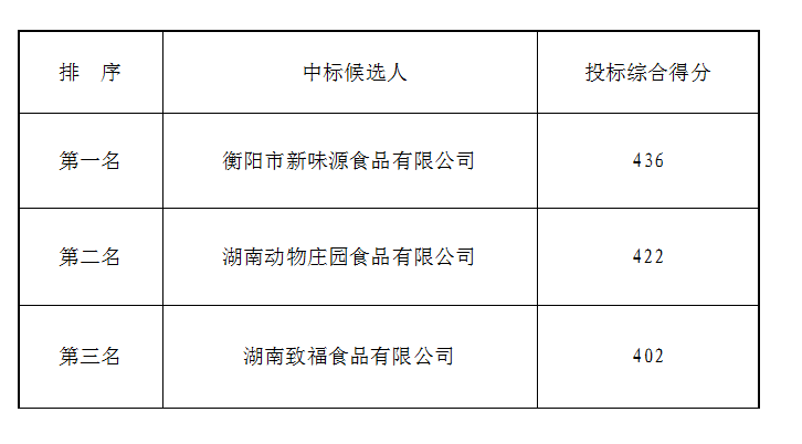 衡陽弘湘食堂食材(肉類)于2021年7月28日下午3時00分(北京時間)進行了比選開標(biāo)、評標(biāo)活動,評標(biāo)小組按照招標(biāo)公告規(guī)定的評標(biāo)辦法及原則進行評定,確定中標(biāo)候選人如下: