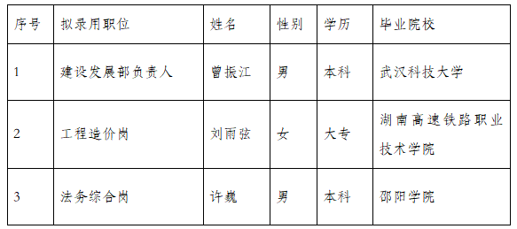 根據(jù)衡陽視界科技發(fā)展有限公司招聘工作方案安排,在集團公司的監(jiān)督指導(dǎo)下,經(jīng)公開面試,擬錄用曾振江等3人為衡陽視界科技發(fā)展有限公司員工,現(xiàn)予以公示。公示期間如有異議,請向衡陽弘湘國有投資(控股)集團有限公司紀(jì)檢監(jiān)察辦公室反映。