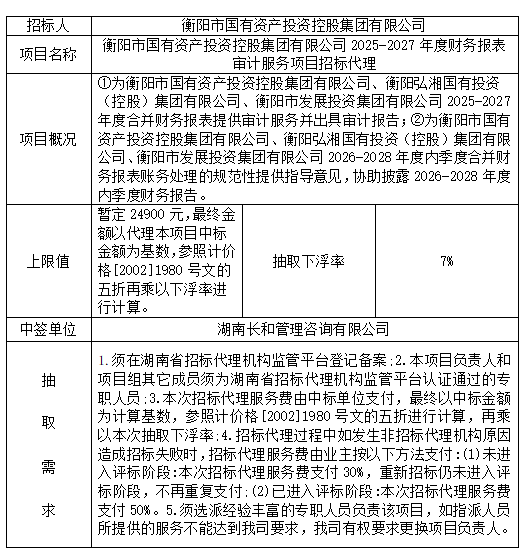 衡陽市國有資產(chǎn)投資控股集團(tuán)有限公司2025-2027年度財(cái)務(wù)報(bào)表審計(jì)服務(wù)項(xiàng)目招標(biāo)代理抽取結(jié)果公示